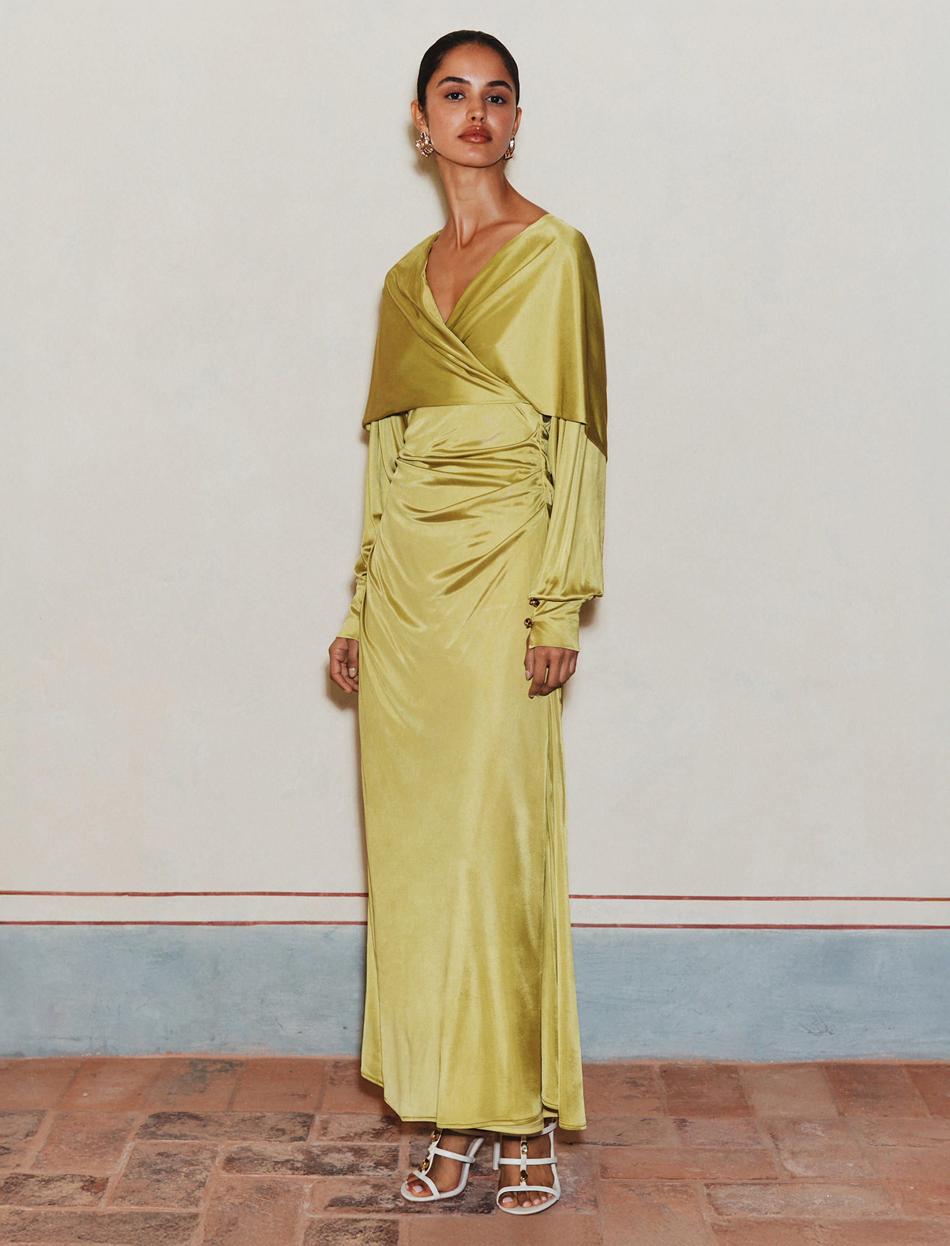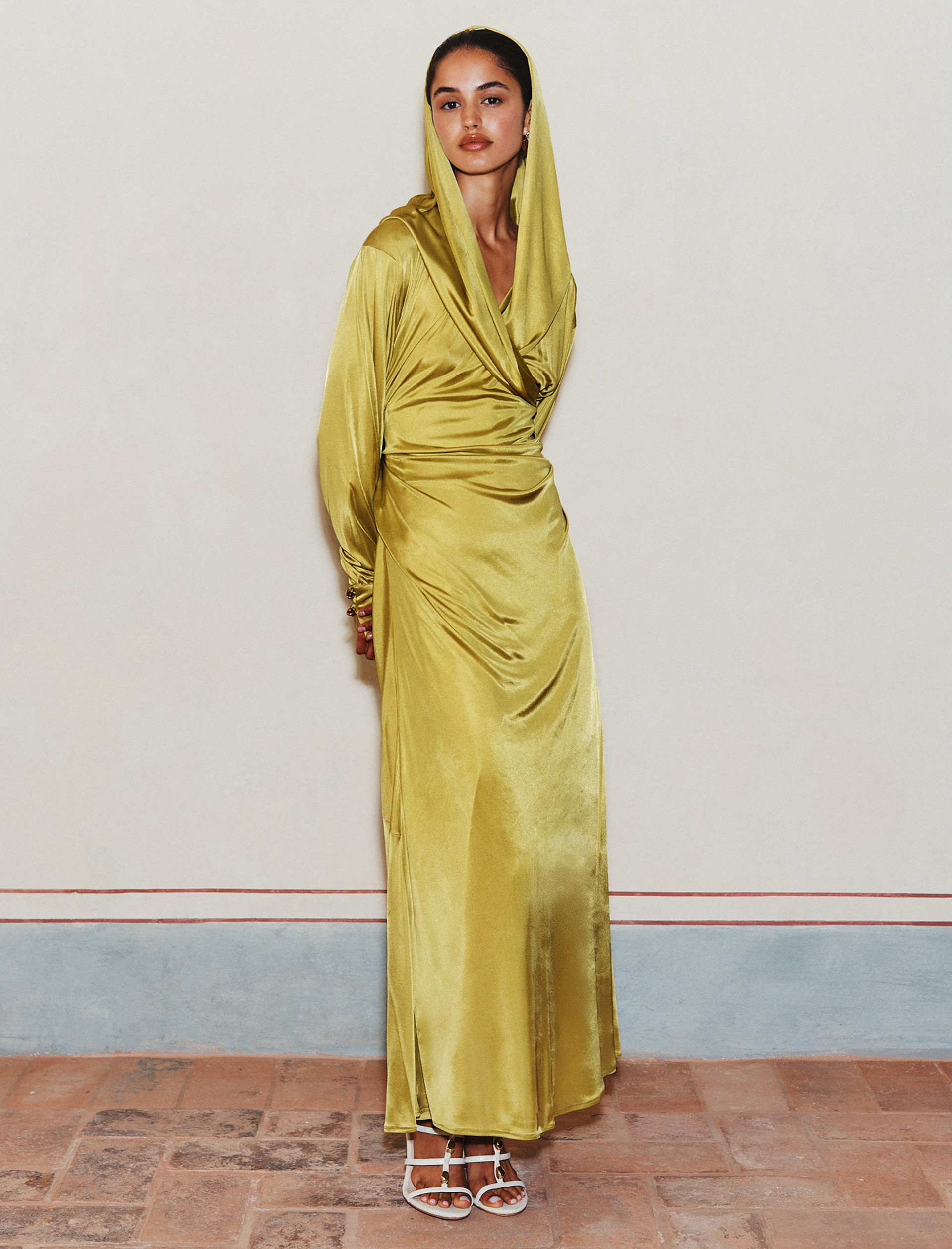 Eine fließende und magnetische Eleganz geht von diesem Kleid aus satiniertem Jersey aus. Es gleitet über den Rumpf und wird entweder mit aufgesetzter oder mit weich auf den Schultern liegender Kapuze getragen. Drapierungen und Falten fangen das Licht bei jeder Bewegung ein.