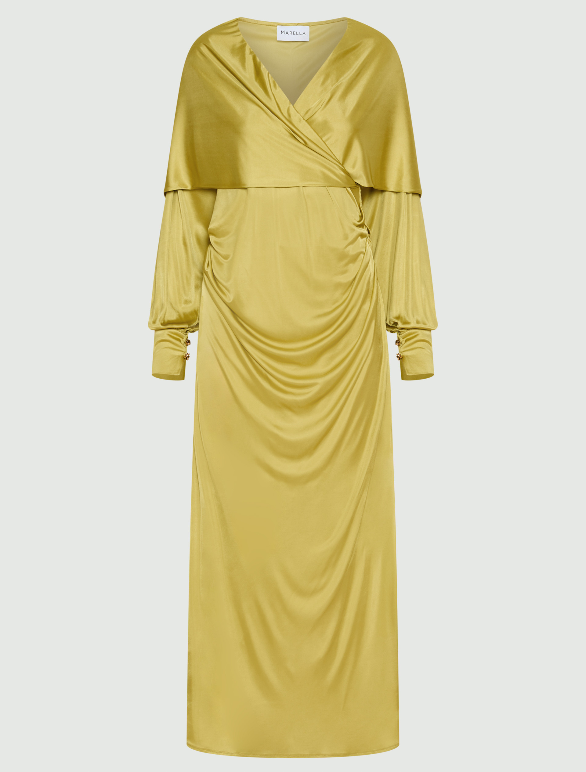 • Drapierungen und Raffungen entlang der Seiten am Oberkörper und Manschetten mit Kunstharzknopf in Schildpattoptik